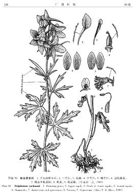Plate 50 Delphinium yuchuanii 1. Flowering plantꎻ 2. Upper sepalꎻ 3. Petalꎻ 4. Lower sepalsꎻ 5. Lateral sepalsꎻ
