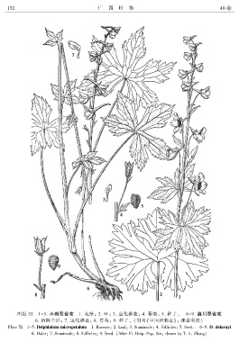 图版 52 1-5. 小瓣翠雀花 1. 花序ꎻ 2. 叶ꎻ 3. 退化雄蕊ꎻ 4. 蓇葖ꎻ 5. 种子ꎮ 6-9. 滇川翠雀花
