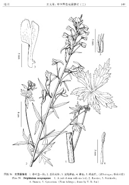 Plate 58 Delphinium zuogongense 1. A part of stem with one leafꎻ 2. Racemeꎻ 3. Staminodeꎻ