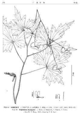 1 7 4 广 西 植 物 40 卷 图版 66 大藏翠雀花 1. 植株全形ꎻ 2. 退化雄蕊ꎻ 3. 雄蕊ꎻ 4. 心皮ꎮ (引自王文采ꎬ 2010ꎻ 孙英宝绘) Plate 66 Delphinium dazangense 1. Habitꎻ 2. Staminodeꎻ 3. Stamenꎻ 4. Carpel. (After W. T. Wangꎬ 2010ꎻ drawn by Y. B. Sun)