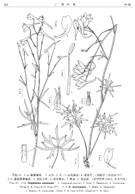 Plate 83 1-4. Delphinium autumnale 1. Compound racemeꎻ 2. Leafꎻ 3. Staminodeꎻ 4. Gynoecium.