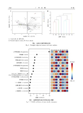 1 0 2 4 广 西 植 物 43 卷 A. 主成分分析ꎻ B. 聚类分析ꎮ A. Principal component analysisꎻ B. Cluster analysis. 图 2 主成分分析和聚类分析 Fig. 2 Principal component analysis and cluster analysis 图 3 主要挥发性成分的 PLS ̄DA 系数 Fig. 3 PLS ̄DA coefficients of main volatile components