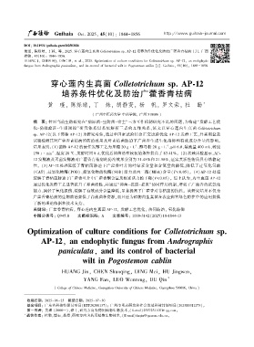 黄瑾ꎬ 陈烁晴ꎬ 丁妹ꎬ 等ꎬ 2025. 穿心莲内生真菌 Colletotrichum sp. AP ̄12 培养条件优化及防治广藿香青枯病 [J]. 广西