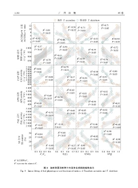 1 1 3 0 广 西 植 物 45 卷 2 2 R 表示调整 R ꎮ 2 2 R represents the adjusted R . 图 8 池杉和落羽杉叶片生理生化指标的线性拟合 Fig. 8 Linear fitting of leaf physiological and biochemical indices of Taxodium ascendens and T. distichum