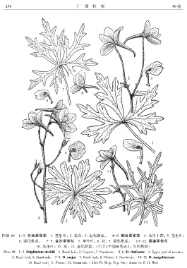 5. Basal leafꎻ 6. Staminode. 7-9. D. majus 7. Basal leafꎻ 8. Flowerꎻ 9. Staminode. 10-12. D. nangchienense