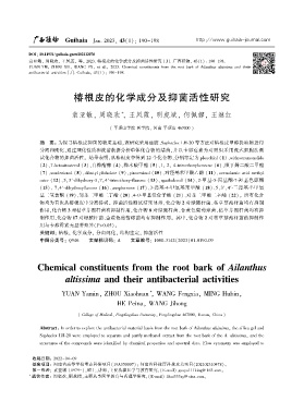关键词: 椿根ꎬ 化学成分ꎬ 分离纯化ꎬ 结构鉴定ꎬ 抑菌活性