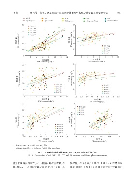 Fig. 3 Correlations of soil SOCꎬ TNꎬ TP and TK contents in different plant communities